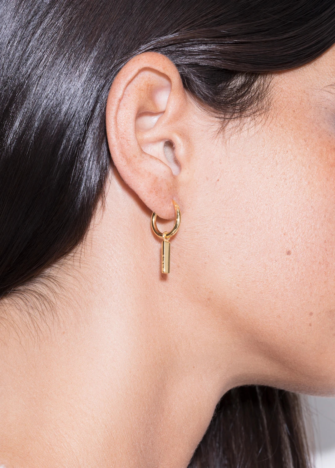 Bela Huggies — simplicidade que se move consigo.& Feitos em prata 925, com acabamento em ródio branco ou banho de ouro amarelo 24k, estes brincos reinterpretam o clássico huggie com um charme vertical minimalista gravado com a precisão característica da CINCO.